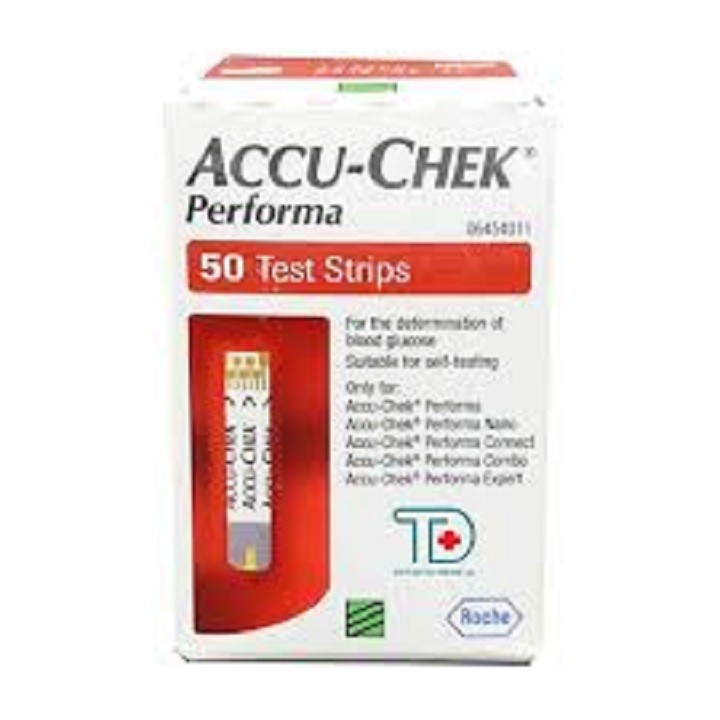 Que thử đường huyết Accuchek Performa 50 là phụ kiện đi kèm của máy đo đường huyết hiệu Roche, được sản xuất theo dây chuyền tiên tiến hiện đại của Đức. Que thử chỉ sử dụng được cho máy đo đường huyết Accu-chek performa và Accu-check Performa 2014. Que thử được tích hợp công nghệ cảm ứng điện cực có khả năng tự động hút máu lên và đo kết quả. Với tính năng này que chỉ cần 1 giọt nhỏ (khoảng 0.6uL) máu tươi trong mao mạch lấy từ đầu ngón tay hoặc lòng bàn tay.TÍNH NĂNG NỔI BẬT CỦA QUE THỬ ĐƯỜNG HUYẾT ACCUCHEK PERFORMA 50